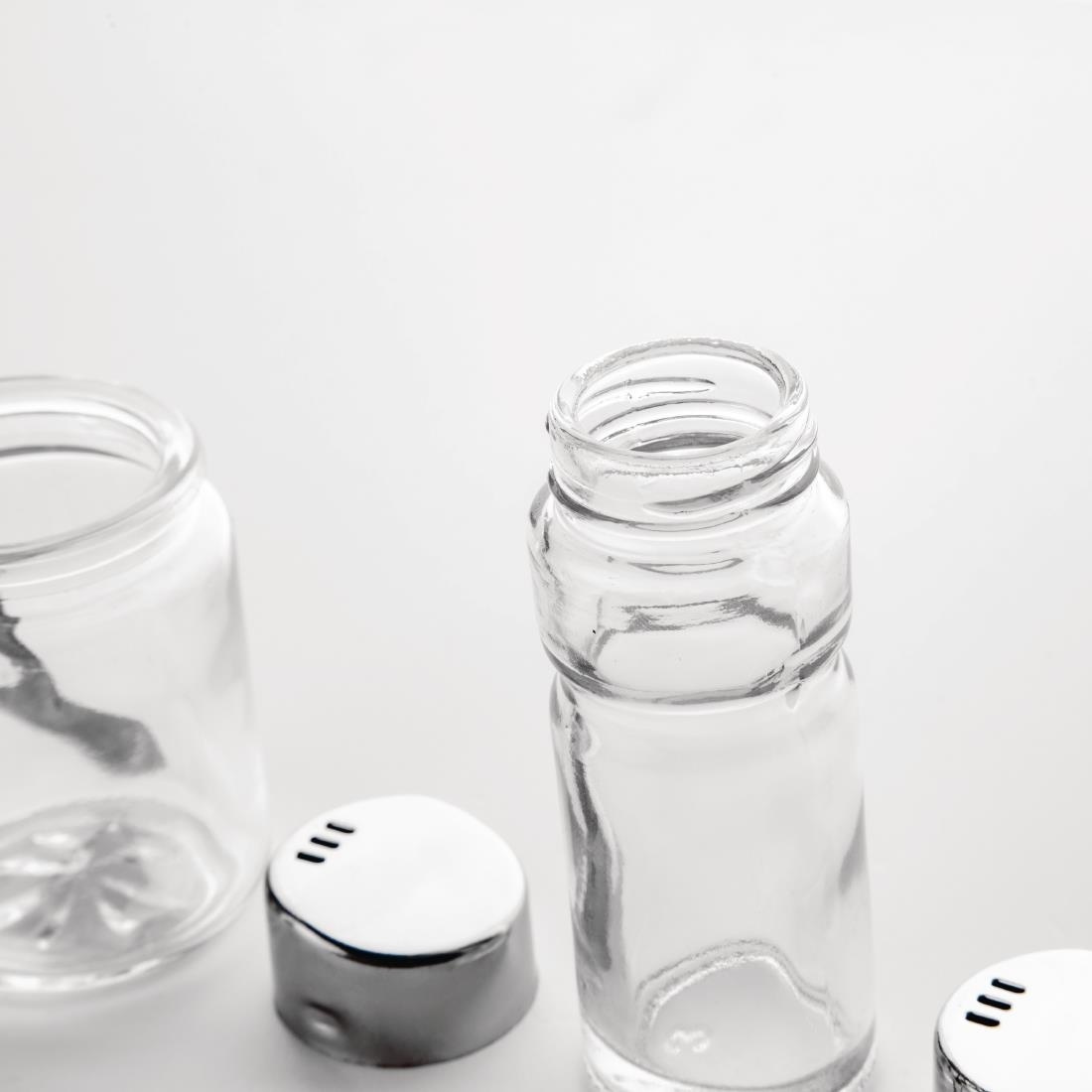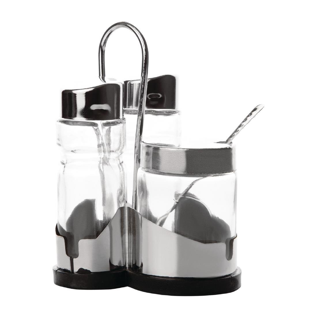 Ménagère 3 pièces, support en acier inoxydable avec base en plastique noir. Salière, poivrière, et récipient à moutarde en verre avec couvercles en acier inoxydable.