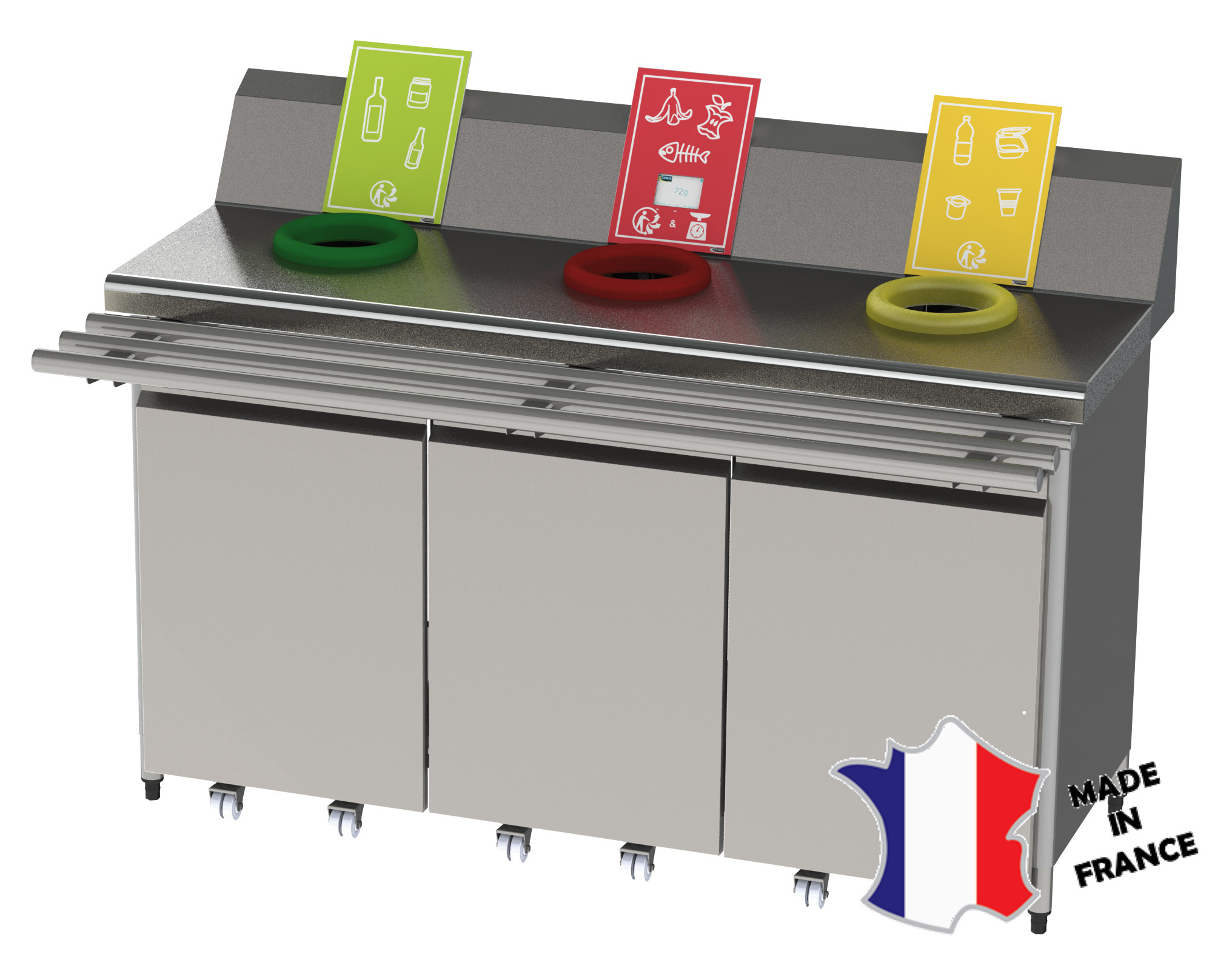 Meuble de pré-tri | 3 trous vide déchets dont 1 avec pesée | 1600(l)x600x900mm | roulettes inox