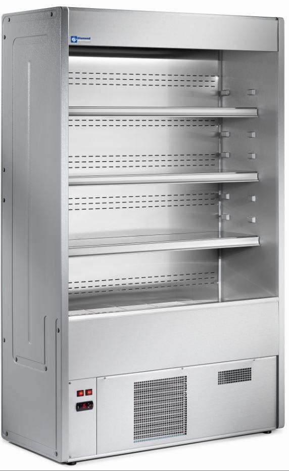 3 tablettes (280 mm) d'exposition (Inox) réglables. Munie de moulures "porte-prix".