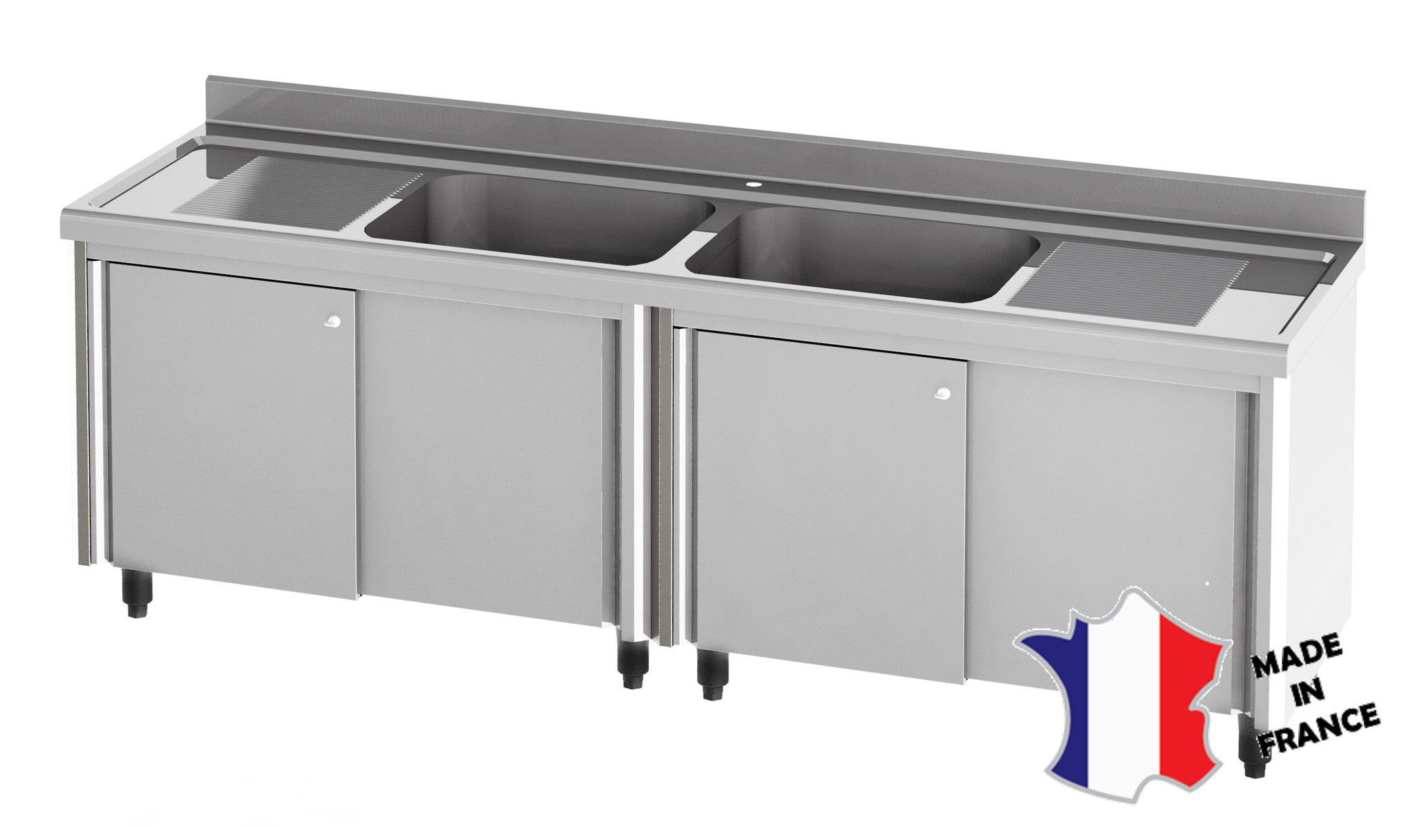 Meuble plonge rayonne | Inox | portes et parois doubles | 2 bacs | 2 égouttoirs | 2100(l)x700x900mm
