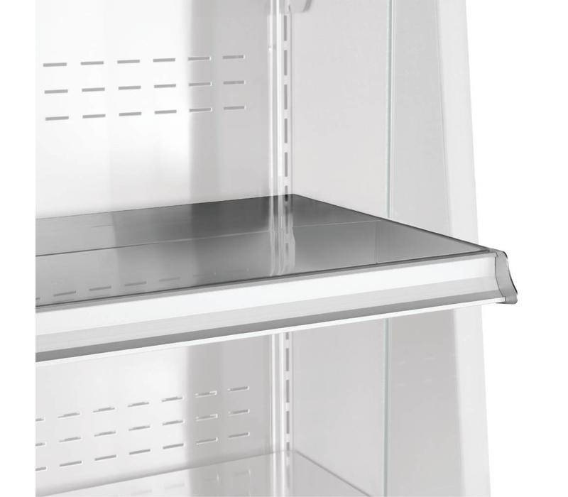 - 4 tablettes d'exposition (340 mm) (Inox) munie de moulure "porte prix". Crémaillères réglables, possibilité d'inclinaison des consoles.