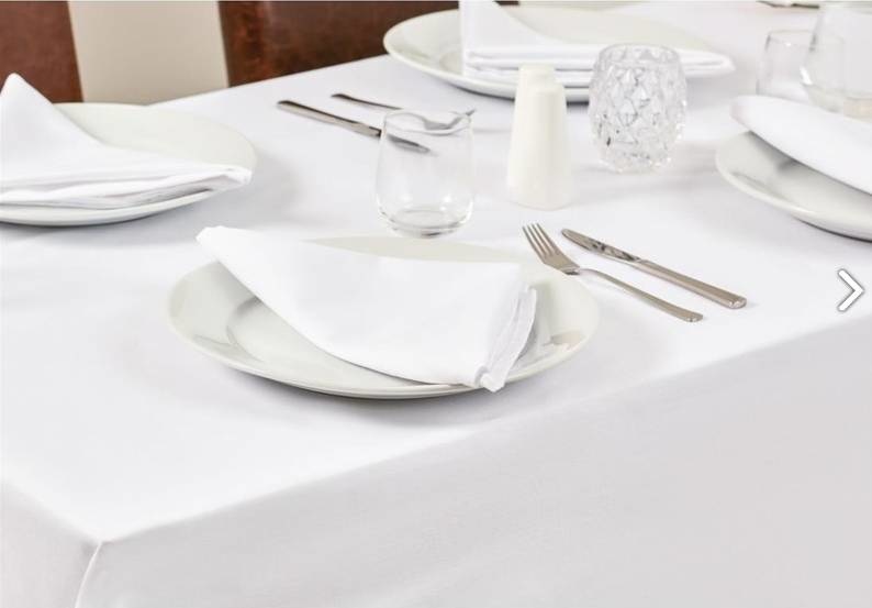 Cette nappe en polyester de première qualité présente une texture lin classique et est aussi douce que le coton. Les nappes et les serviettes ont des bords ourlés. Matière: 100% polyester. Couleur: blanc Densité du fil: 12/12. Poids: 230g / m².