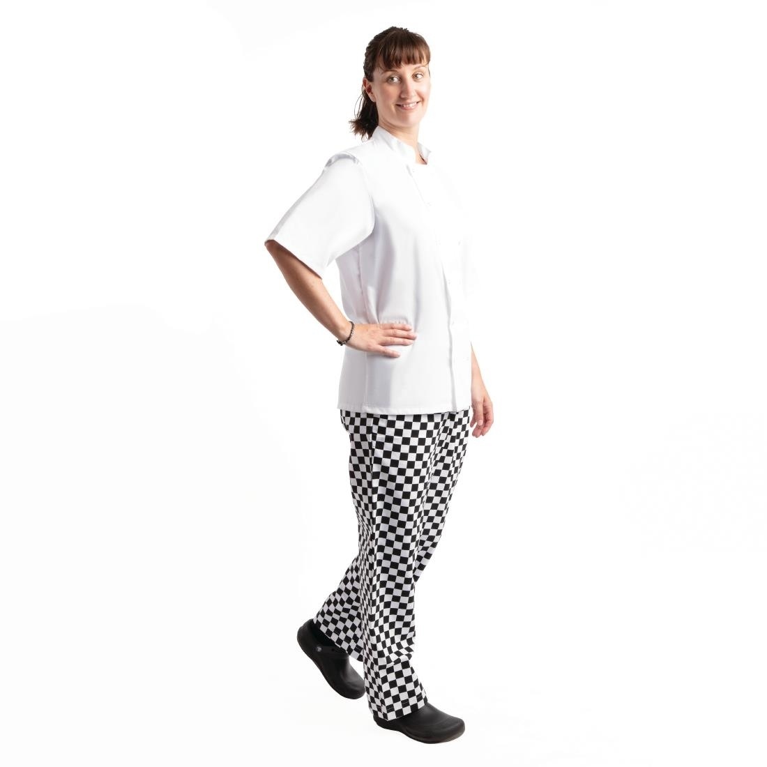 Pantalons mixte à carreaux blanc et noir pour une utilisation quotidienne en cuisine. Traités au Télfon pour protéger contre les éclaboussures ou déversements qui glissent sur la surface. Lavage facile sans aucun bouton susceptible de se casser. Le pantalon peut être retroussé s'il est trop long.