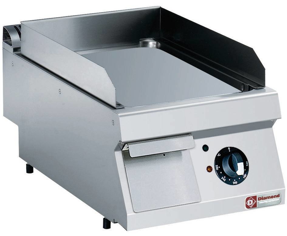 Plaque de cuisson à haute conductibilité thermique, rebord périphérique soudé garantissant une parfaite étanchéité. Tiroir de récupération du jus de cuisson.