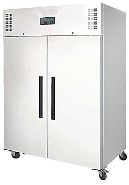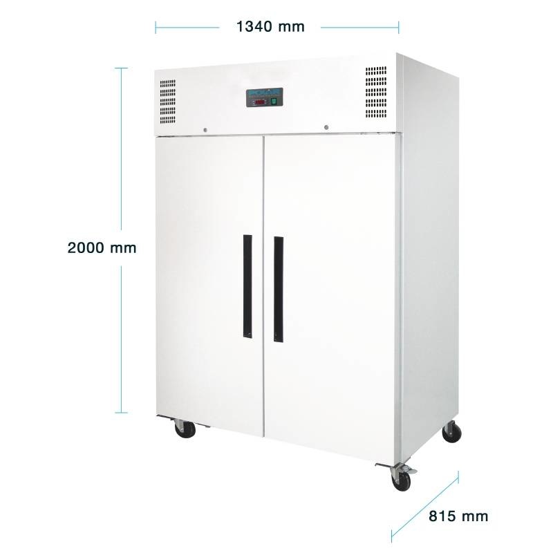 Armoire réfrigérée deux portes Polar, extérieur en acier peint et avec contrôle thermostatique précis Dixell. Possède un affichage digital LED de la température, des roulettes standards, un compresseur Polar puissant, 6 étagères réglables, 1 protection de sol et un moteur à froid ventilé pour un refroidissement rapide. Température ambiante maximum : 32°C.