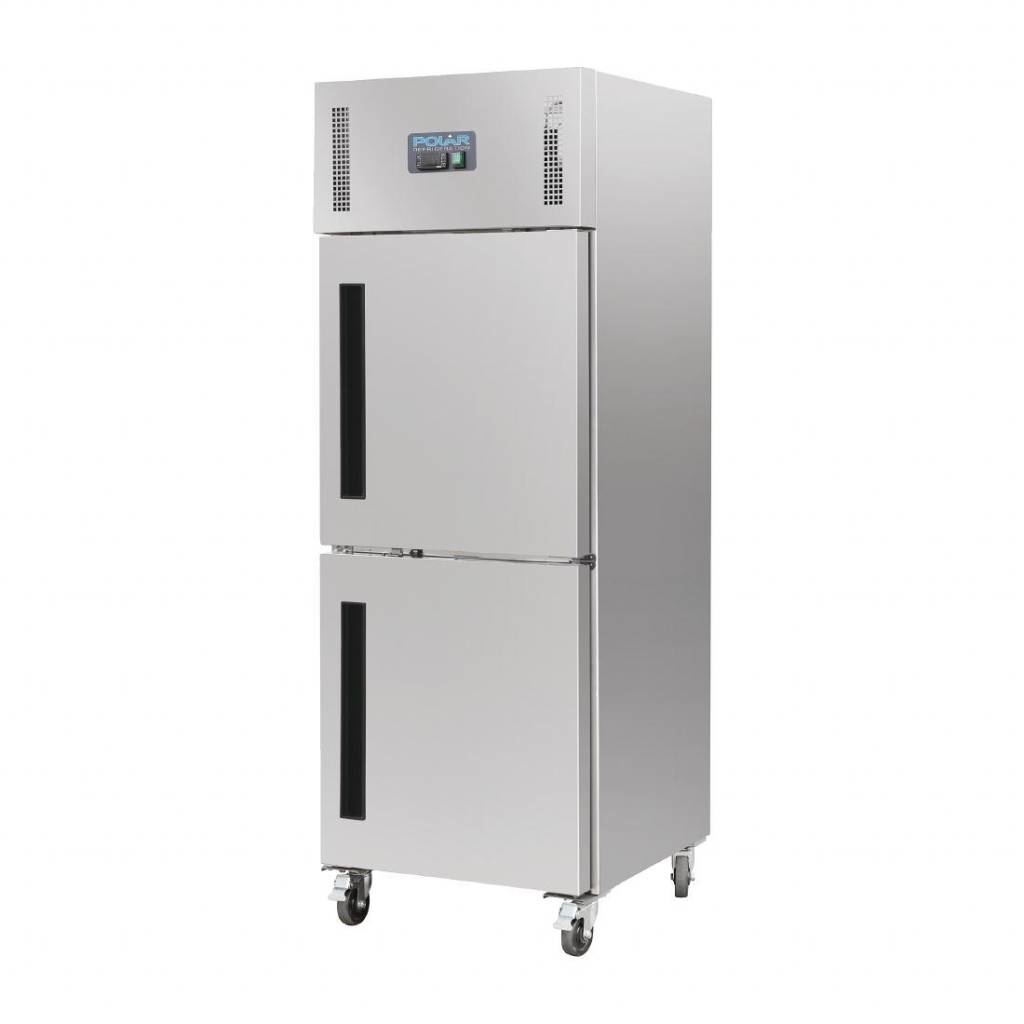 Armoires avec 2 portillons 50/50. Le fait de placer les produits les plus utilisés dans la partie supérieure et d'ouvrir un seul portillon permet à l'air froid de descendre dans la partie inférieure et de re-circuler lors de la fermeture de la porte, ce qui permet un retour en température plus rapide et plus efficace. Capacité 600L (10 x GN 2/1 - profondeur 100mm). Pour une utilisation peu à moyennement intensive. Roulettes verrouillables.
