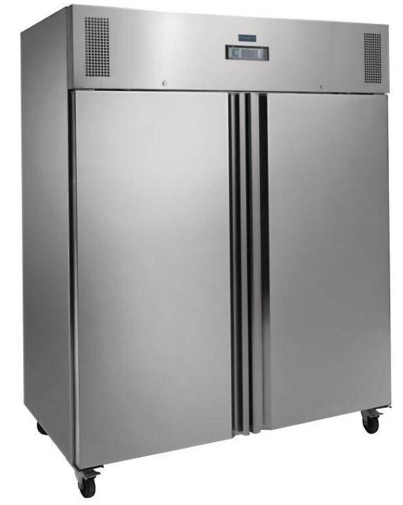 Armoire verticale gastronorme 1300 litres à double porte, grande capacité de stockage. Thermostat de contrôle automatique REK33 Ektron. Froid ventilé pour le stockage de denrées dans les cuisines professionnelles de volume intensif. La température revient rapidement à niveau même en cas d'ouverture fréquente des portes. Commande entièrement automatique avec affichage numérique constant. Dégivrage automatique et roues verrouillables. Sans CFC.