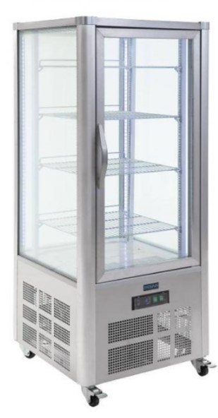 Vitrine à pâtisserie attrayante et élégante, finition acier inoxydable. 4 côtés vitrés pour présenter les gâteaux, pâtisseries et desserts. Contrôle entièrement automatique avec affichage digital constant et auto-dégivrage. Possède 4 étagères.