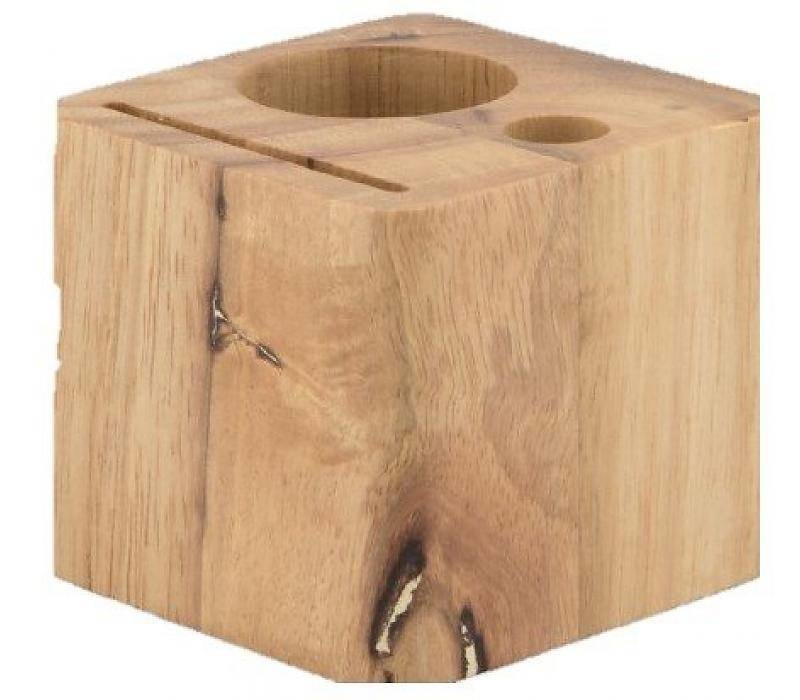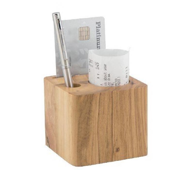 Porte-Addition dans un bloc de bois, avec 3 compartiments pour maintenir une carte de crédit, un stylo ainsi que l’addition. Dim. 70x80x80mm.