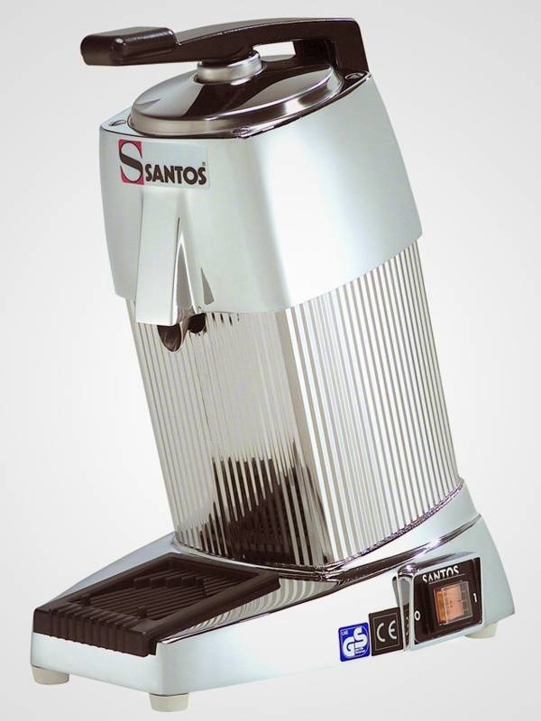 chromée, matériaux non-oxydables, extraction maximale du jus par centrifugation, une simple pression sûr le levier provoque l'embrayage de l'ogive, toutes les pièces en contact avec le jus de fruit sont en acier inoxydable, sécurité: commandes marche-arrêt au moyen du levier, démontage rapide et nettoyage facile de l'ogive