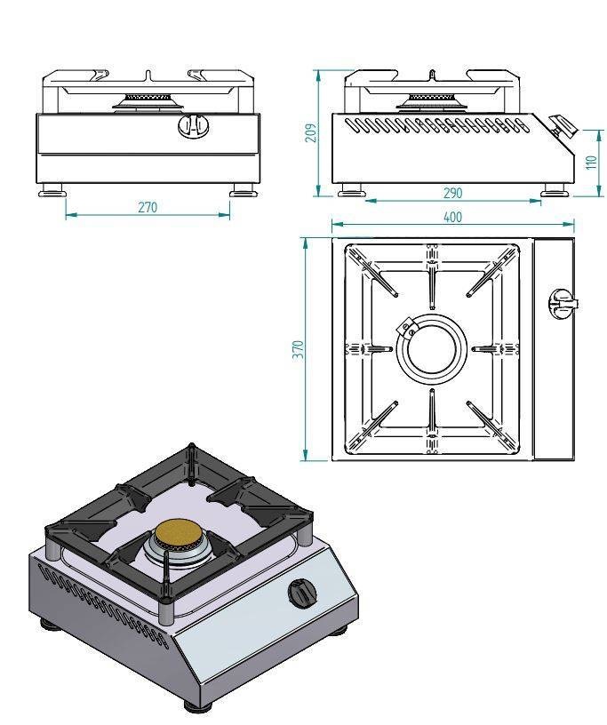 Réchaud de Comptoir gaz | 1 feu vif | 5 kW | 380x400x(h)200mm