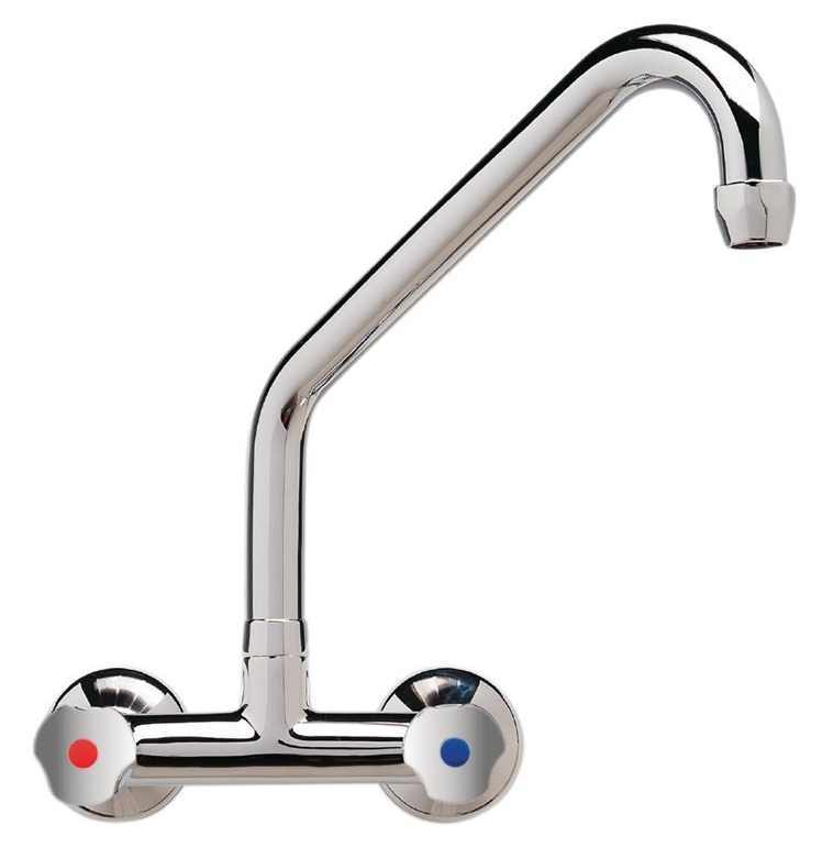 Robinets mélangeur bi-trou standard fixation murale col haut adaptés à une utilisation en cuisine professionnelle. Fabriqués à partir de laiton chromé et en céramique de haute qualité pour des performances et une durabilité accrues.