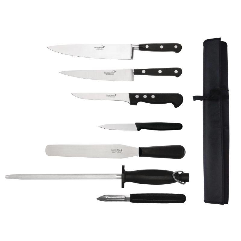 Couteaux Déglon Sabatier de qualité professionnelle avec rivets et lames en acier inoxydable. Fournis dans un étui noir avec un couteau d'office 7cm Victorinox, une spatule 20,5cm Hygiplas, un fusil à aiguiser 25cm Vogue et un économe Vogue. Résistants au lave-vaisselle.