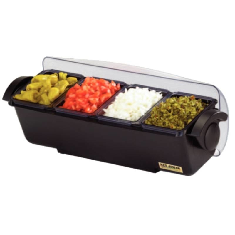 Convient en tout lieu et permet le stockage des garnitures, condiments, des pailles, des agitateurs ou pics de différentes tailles. Packs réfrigérés également disponibles pour maintenir les condiments à la température désirée (vendus séparément - DM114).