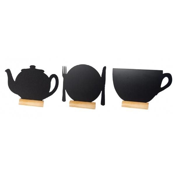 Ces 3 ardoises tasse, asiette et théïère peuvent être placées sur une table ou un comptoir, elles permettent de présenter des offres, des menus. Vous pouvez également vous en servir pour décorer votre cuisine ou votre salon. Les ardoises sont équipées d'une solide base en bois.- inclus: 1 feutre craie blanc