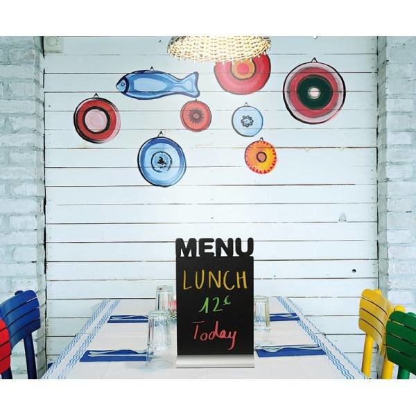 Cette ardoise de table Securit en forme de Menu est idéale pour les bars, snacks ou encore restaurants. Vous pouvez y écrire vos promotions, vos offres ou spécialités.Ardoise utilisable recto verso, facile à nettoyer avec une éponge. L'ardoise est amovible et est livrée avec un feutre craie blanc.
