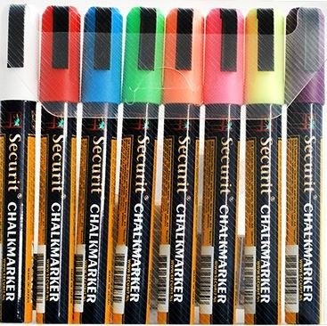 Lot de 8 feutres craies Securit à encre liquide, de couleur blanche, rouge, bleue, verte, orange, rose, jaune et violette. Idéal pour écrire vos menus, réductions, spécialités ou évènements. tilisation prévue pour des ardoises murales, panneaux trottoir, miroirs, vitrines, plastiques, métal, verre, ardoise et toute autre surface non poreuse.- Dimensions de pointe: 2-6mm