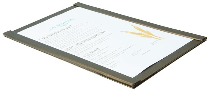 Une protège-menu en couleur Marron. C'est une protège-menu magnétique, qui a un surface en simili cuir aux bords magnétique pour maintenir votre menu en toute sécurité.- format A4