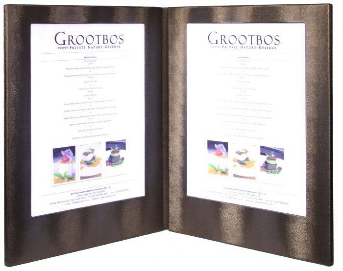 Une Protège-Menu LED en format A4 DOUBLE et effet cuir cuivre. Elle s'éclaire automatiquement à l'ouverture. C'est facile à nettoyer ce protège-menu. Temps de chargement de 3 heures et l'autonomie de la batterie est 8 heures.- dimensions: 35x27x2cm