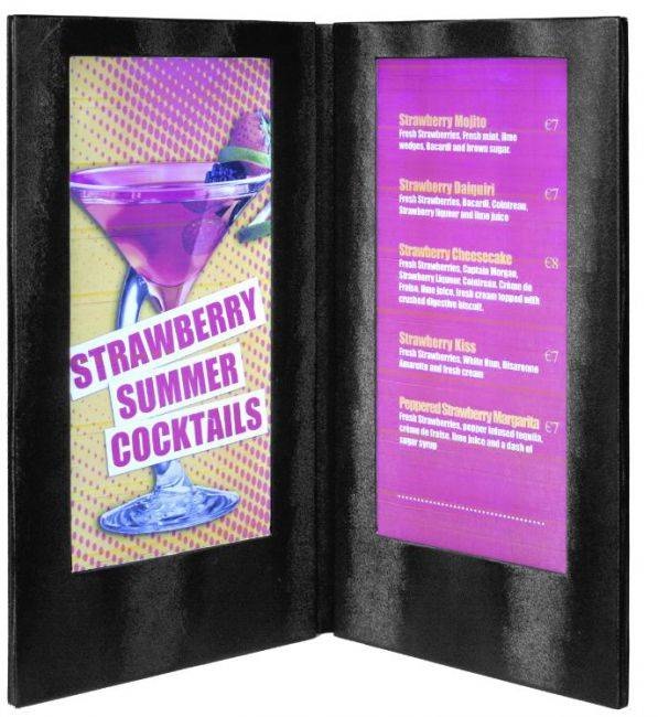 Une Protège-Menu LED en format A4 DOUBLE et effet cuir Noir. Elle s'éclaire automatiquement à l'ouverture. C'est facile à nettoyer ce protège-menu. Temps de chargement de 3 heures et l'autonomie de la batterie est 8 heures.- dimensions: 35x27x2cm