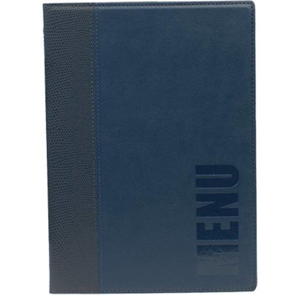 Ce protège menu bleu de la ligne Trendy se décline en format A5. Il permet de présenter 4 pages et est idéal pour les restaurants, bars et hôtels. Ce porte-menu en simili cuir a un design moderne, élégant et original qui s'intégrera aisément au style de votre établissement. Il possède un double insert amovible. Ce protège menu est facile à nettoyer avec un chiffon humide. Il est fourni avec 1 inserts.- dimensions: 18x25 cm