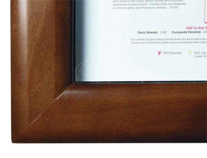 Le cadre est de couleur marron foncé et on peut l'accrocher au mur ou à monter sur un pied. Le présentoir s'utilise sur secteur grâce au câble de 5 mètres (inclus) ou avec un batterie de Securit (non incluse). Vous pouvez l'utliser aussi bien en intérieur qu'en extérieur car il résiste à la pluie.