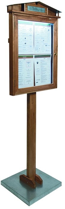 Une set de vitrine d'affichage menus de la marque sécurit avec éclaire LED et un pied. C'est une modèle rustic. Le cadre est en Acajou avec toit en zinc à accrocher au mur ou à monter sur un pied. Le présentoir s'utilise sur secteur grâce au câbe de 5 mètres (inclus) ou avec une batterie Securit (non incluse).