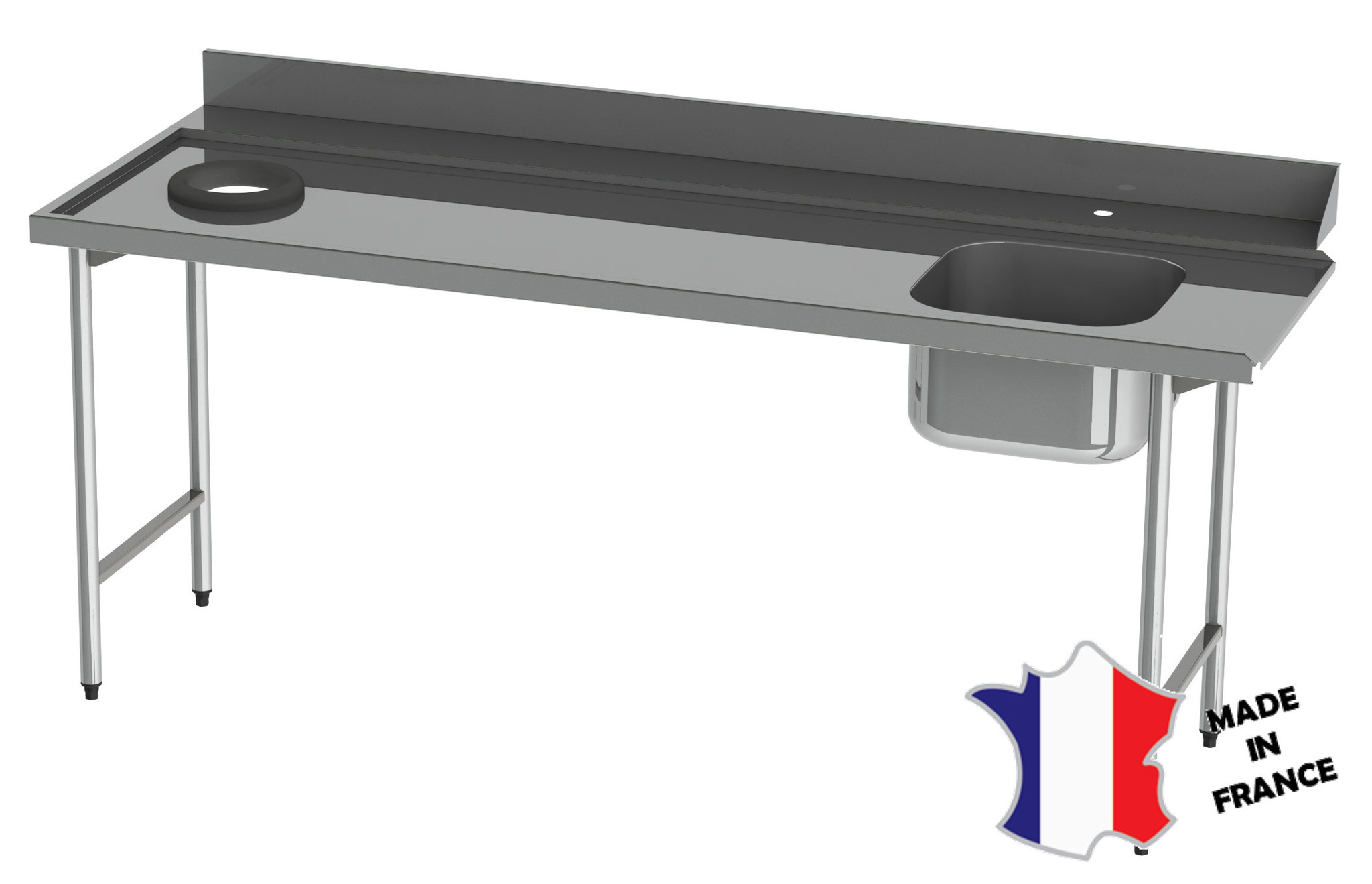 Table de glissement avec plage arrière, dosseret, et 1 cuve de 400X400, piétement rond démontable 4 pieds - accr a gauche - et TVO Tout inox AISI 304L- Dessus ép 15/10ième- Plage arrière. Dosseret de 100x20 -Piétement en tube rond diam 38mm- Sur vérins AB Lire plus