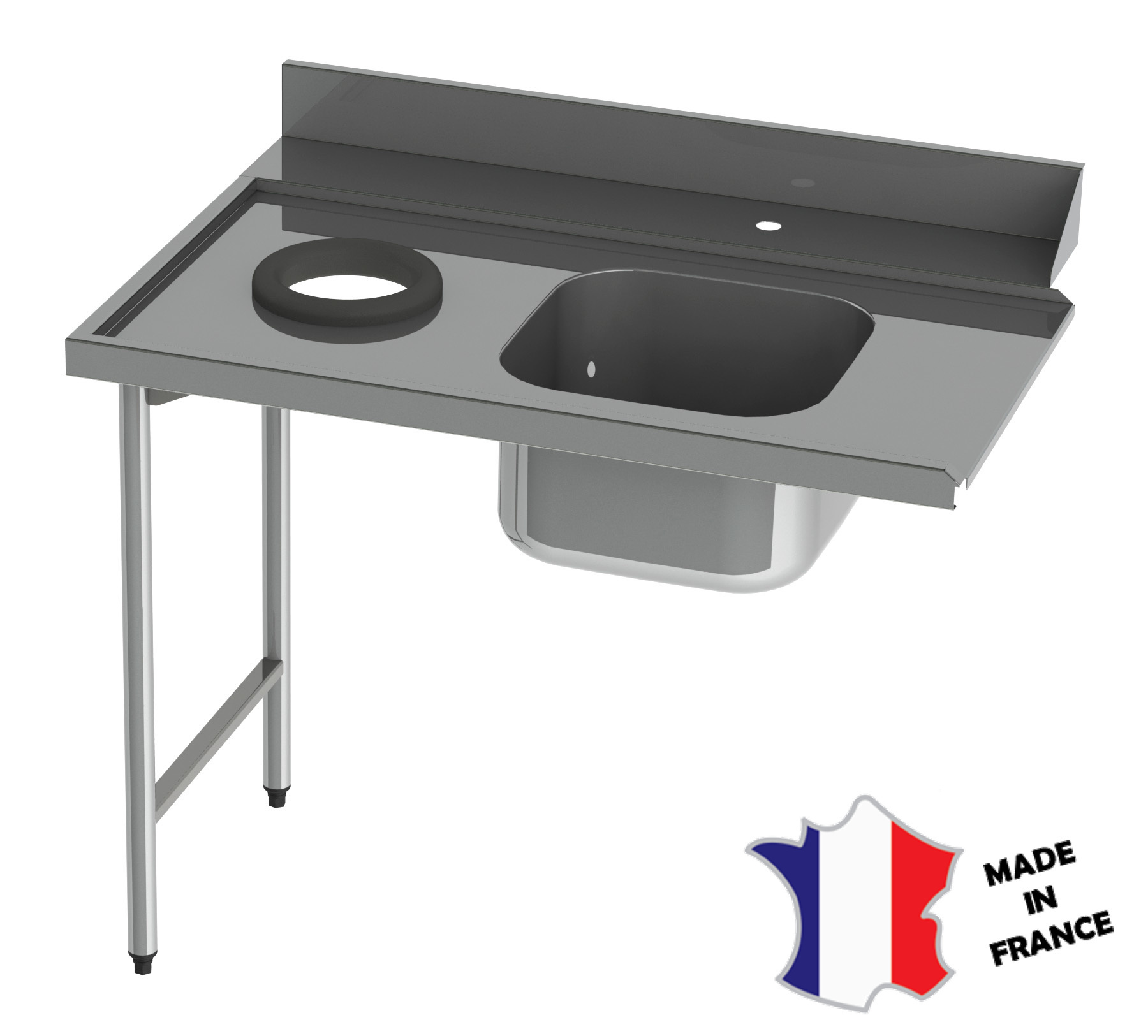 Table de glissement avec plage arrière, dosseret, et 1 cuve de 400X400, piétement rond démontable 2 pieds - accr a droite - et TVO-Tout inox AISI 304L- Dessus ép 15/10ième- Plage arrière.