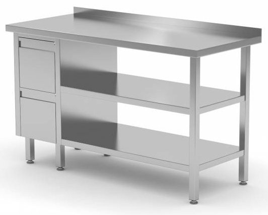 Table de Travail | INOX | 2 Tiroirs | 2x Etagère Basse | Rebord | 800(l)x600(p)mm | Choix de 12 Largeurs