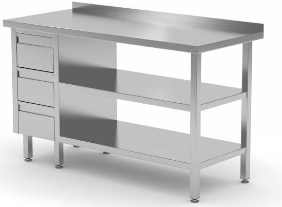 Table de Travail | INOX | 3 Tiroirs | 2x Etagère Basse | Rebord | 800(l)x600(p)mm | Choix de 12 Largeurs