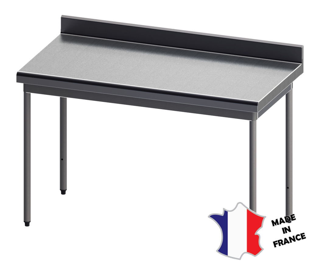 Table à dosseret démontable rayonnée DIM 800x800 ht 900. Dessus inox AISI 304L, ép 15/10ième renforcé par un panneau collé en mélaminé hydrofuge de 19mm. Rayon de 20mm, Bord tombé de 60mm, coins soudés. Pieds en tube inox AISI 304L Ø38 sur 4 roulettes po Lire plus