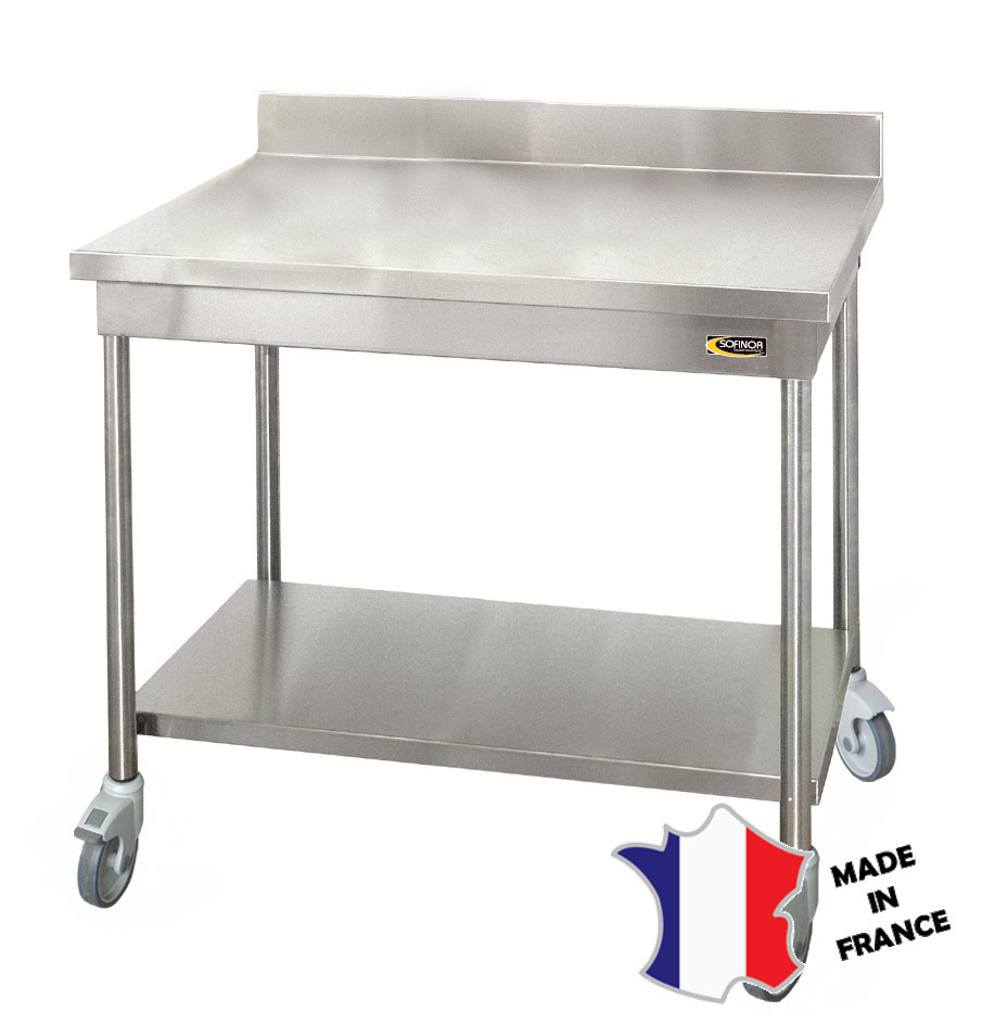 Table démontable standard | Inox | à dosseret | avec étagère basse | pieds ronds | 600(l)x600x900mm | sur roulettes inox