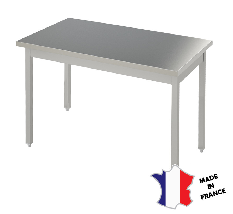 Table démontable à bords droits tombés de 40mm, tout inox AISI441.DIM 1000x700 ht 900. Dessus central en tôle inox AISI 441, coins pliés. Renforcé par un panneau collé en mélaminé hydrofuge de 19mm.