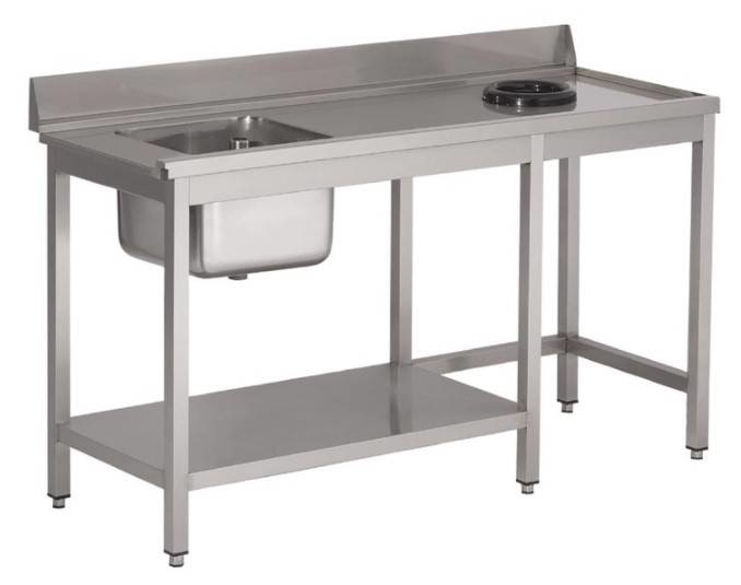 Table d'entrée lave-vaisselle en acier inoxydable AISI 304 avec bac, dosseret, tablette inférieure et TVO (trou vide-ordures). Pieds carrés 40x40mm hauteur réglable. A positionner à droite du lave-vaisselle.