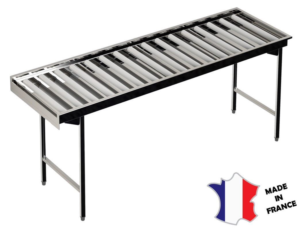 Table à rouleaux 2 pieds ronds démontables. Plateau inox AISI 304L ép 15/10ième. Ecoulement au centre avec pointe de diamant, bonde et siphon pvc.