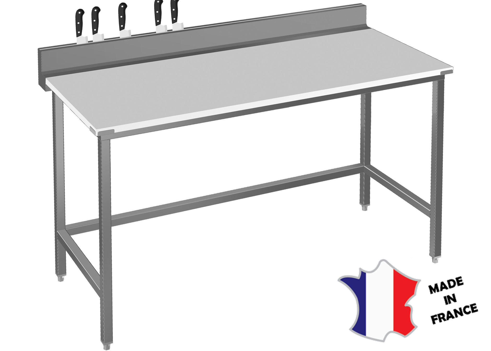 Table de decoupe a dosseret porte couteaux, dessus polyethylene, pieds carrés soudés Dim : 1000x700 Lire plus