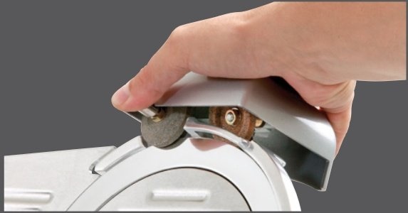 L‘e?quipement de cette trancheuse optimise?e avec une lame de 220 mm se distingue a? plusieurs points de vue par ses caracte?ristiques techniques. La trancheuse en porte-a?-faux puissante dispose d‘un bac de re?cupe?ration des restes, d‘un aiguiseur de lame, d‘un syste?me de guidage de coupe ainsi que d‘une double protection de la lame et d‘un commutateur magne?tique pour assurer la se?curite?.