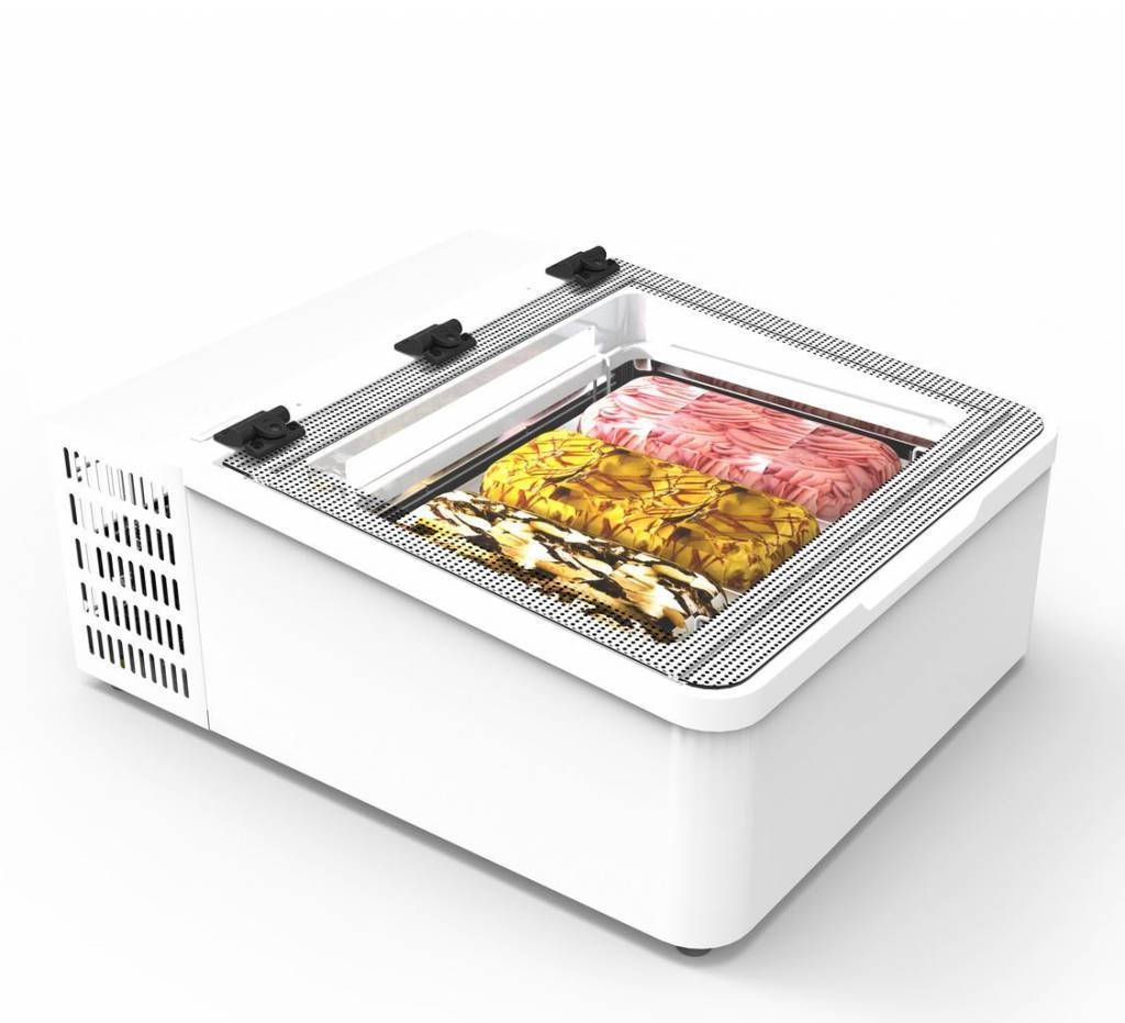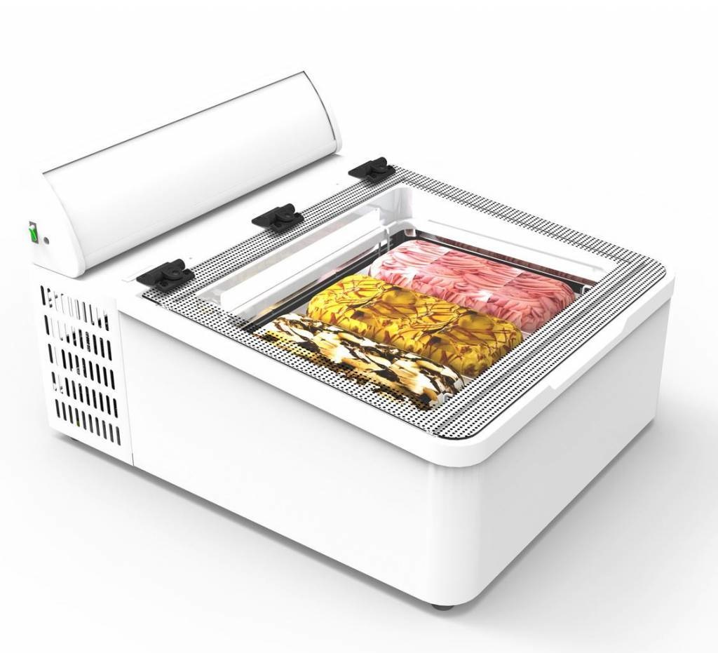 - Extrêmement adapté à la vente de crème glacée scoop où il n'y a pas de place pour une vitrine plus grande. La Mini Crème de Framec peut être utilisée partout grâce à ses dimensions compactes. Dans cette vitrine de montage de pelle, vous pouvez perdre 3 emballages standard de 5 litres ou une combinaison de 2 demi-bacs. La Mini Cream 3V LED est équipée d'un LED Eclairage interne et d'un couvercle en verre rabattable.