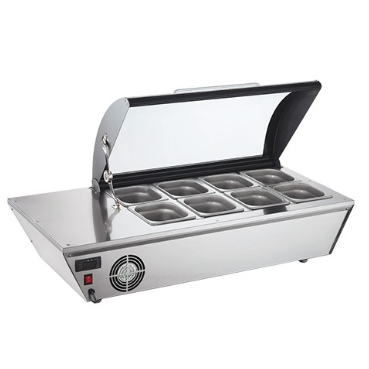 gastronorme profondeur jusqu'a 10cm, inox 18/10 avec couvercle verre sécurité, température réglable par thermostat digital +2°C/+12°C et interrupteur marche-arrêt illumine, livrée avec 8x bacs GN 1/6-100