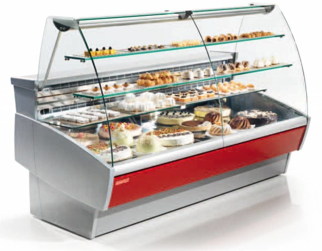 - Vitrine réfrigérée pour gâteaux, prête à l'emploi. Équipé de fenêtres inclinées incurvées.