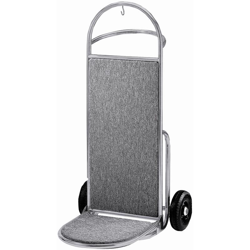 Chariot contemporain et élégant, idéal pour une utilisation dans les zones publiques. Grande capacité de chargement, crochet de suspension, double poignée et deux roues fixes pour transporter facilement les bagages lourds. Base recouverte de moquette grise pour la protection des bagages.