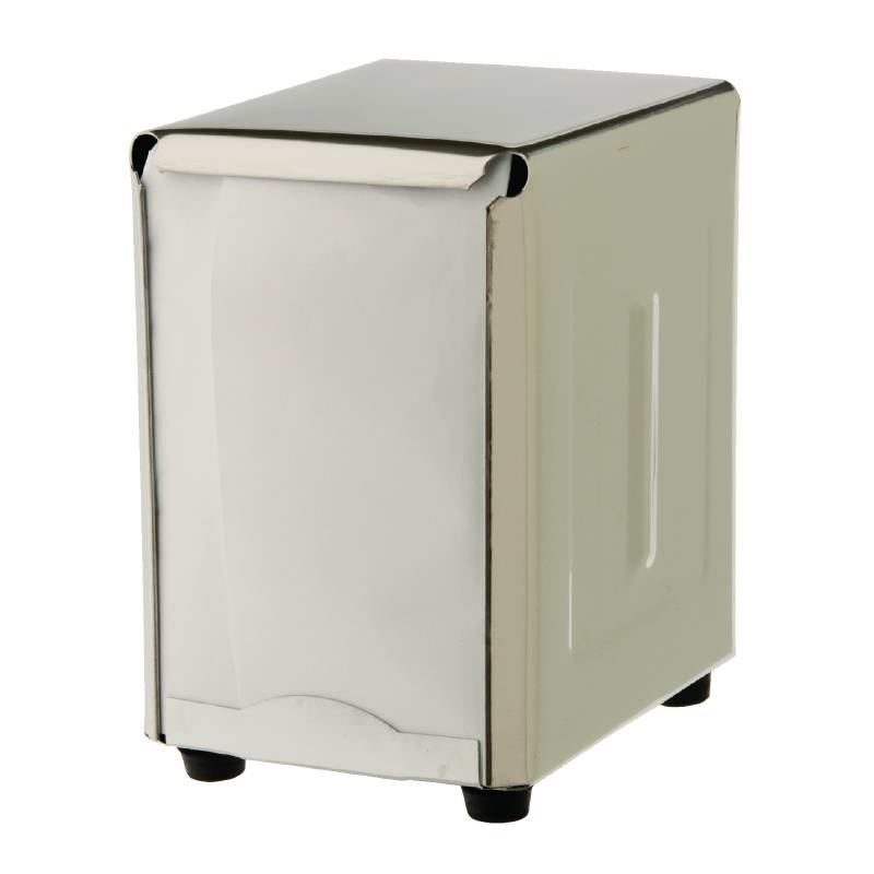 Distributeur classique style années 1950 en acier inoxydable chromé. Remplissage sur les deux côtés. 140 (h) x 95 (l) mm. Serviettes simple épaisseur en papier recylé vendues séparément.