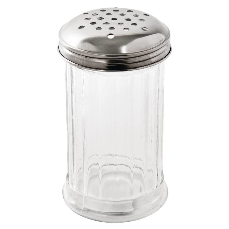Un grand récipient en verre pour le sucre en poudre possédant un couvercle en acier inoxydable avec plusieurs trous de 4mm, pour doser la quantité de sucre; idéal pour les cafés.